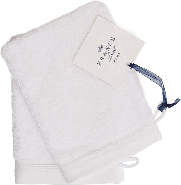France Luxe Body French-Style Bath Mitts are a chic shower staple. Made of soft 100% cotton with a convenient loop for hanging, these plush bath mitts are a perfect way to gently exfoliate your skin for a spa-like radiance while relaxing in the comfort of your own home. Pamper your pores with these luxurious French-inspired washcloths!