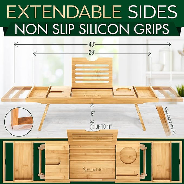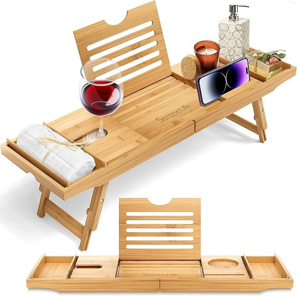 SereneLife Bath Caddy Breakfast Tray Combo - Natural Bamboo Wood Waterproof Tub and Bed with Folding Slide-Out Arms Device Grooves Wine Glass Soap Holder