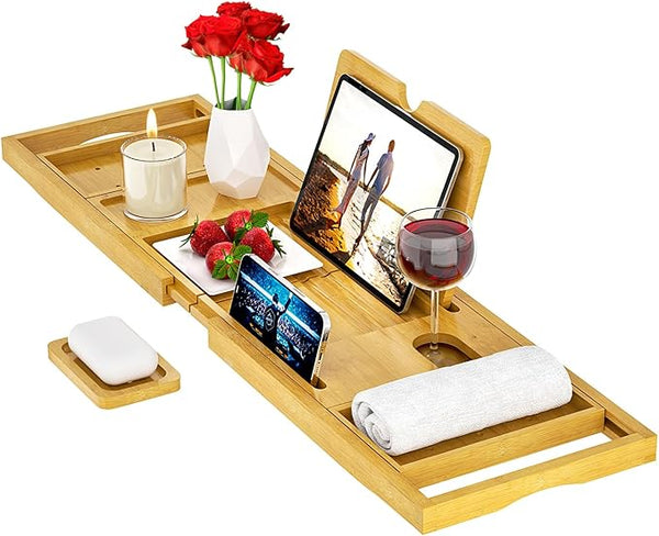 Relax and unwind after a long day & treat yourself to some well deserved me-time with our expandable bamboo bathtub tray. Wash away stressors & bathe in comfort.