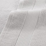 This quality line of towels for the bathroom in six colors in premium soft, ring spun, 100% cotton with a stylish raised matching stripe dobby border. These are soft, durable towels with double-stitched edges. 600 GSM premium ring spun cotton dries fast and resists wrinkles with a quick shake out of the dryer.