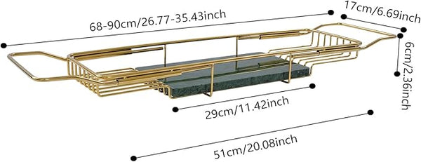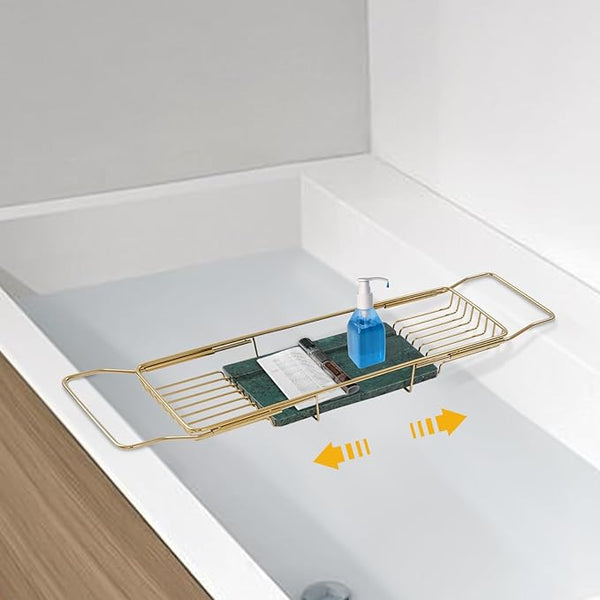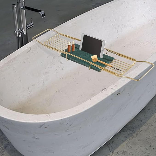 Bathtub Tray for Tub Metal Expandable Extra Wide Bath Caddy Tray for Bathtub with Natural Marble Groove for Bath Spa (Gold Frame Green Marble Base)
