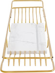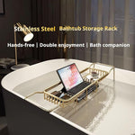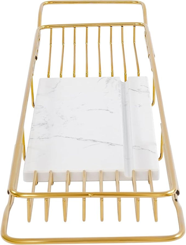 Bathtub Tray Caddy for Luxury Bath, Stainless Steel 26.8-35.4 in Expandable Extra Wide Bath Tub Tray with Natural Marble and Mobile/Tablet Stand, Ideal for Home Spa Lovers (Gold + White)