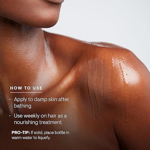 Due to the high content of coconut oil, the product solidifies at room temperature. It can easily be brought back to liquid by warming in warm water, either submerged in a bowl or with you while you take a hot shower.