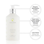 Nourishing Wash for body and hands drenches the skin with 100% organic shea butter as it removes impurities, for lavishly clean, luxuriously soft skin. Ageless Aloe Moisture Wash acts as a gentle facial for the hands and body, with sugar cane and fruit extracts to gently exfoliate without harsh particles. Organic aloe soothes nicks from shaving. Detoxifying lotus flower restores supple, smooth, healthy skin. Use daily for sink, shower, shave, and bath.