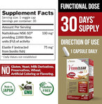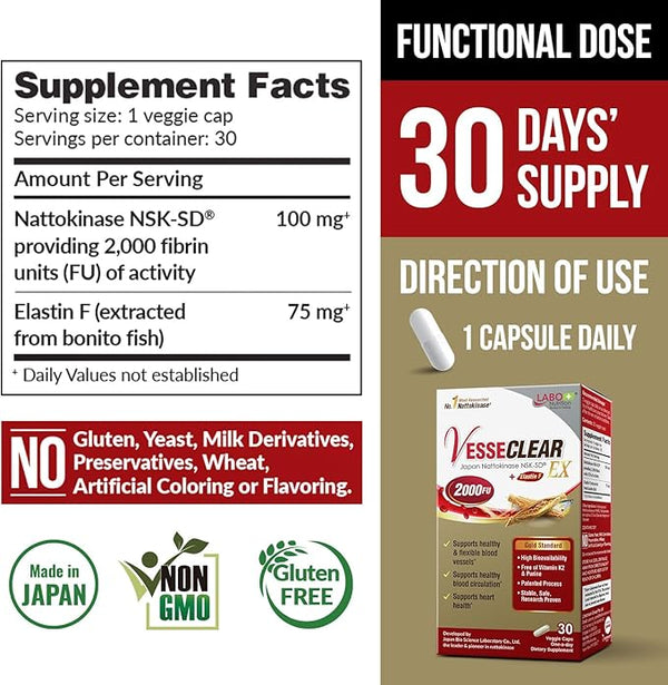 Keeping blood vessels clear and flexible is important for smooth circulation. Developed by Japan Bio Science Laboratory, the leader and pioneer in nattokinase, VesseCLEAR EX is made from 100% concentrated nattokinase NSK-SD and Elastin F to support blood vessels, blood flow and heart function.