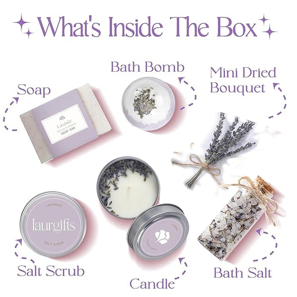 Everything she needs for a spa day at home is inside this lavender gift set. The box includes a soothing candle, bath bomb, bath salts, soap, scrub, and a mini dried bouquet ? each chosen to create a moment of calm and beauty.