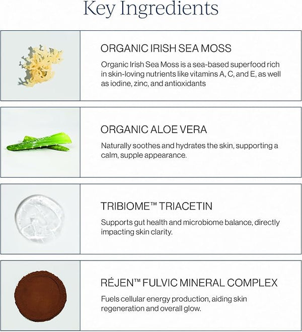 At the heart of the formula is Organic Irish Sea Moss, a sea-based superfood rich in skin-loving nutrients like vitamins A, C, and E, as well as iodine, zinc, and antioxidants. These elements hydrate, enhance elasticity, and help maintain a vibrant.