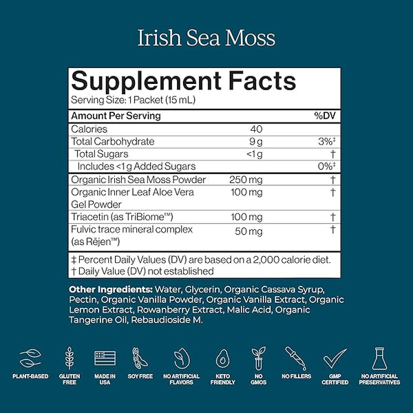 Each box of Irish Sea Moss has 26 packets, each containing the recommended daily serving size.