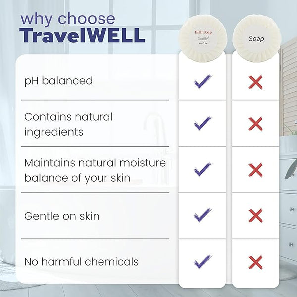 TRAVELWELL Individually Wrapped 30ml Shampoo 25 Bottles + Conditioner, 25 Bottles + Round Tissue Pleated 28g Cleaning Travel Soap In Bulk, 25 Bars