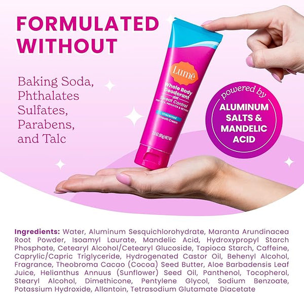 Product descriptionOutrageously Effective Whole Body Deodorant plus Sweat ControlLume Smell Better EverywhereFor Anywhere & EverywhereNot an Ordinary Deodorant!Four Ways To LumeCan I use Lume Whole Body Deodorant Plus Sweat Control...