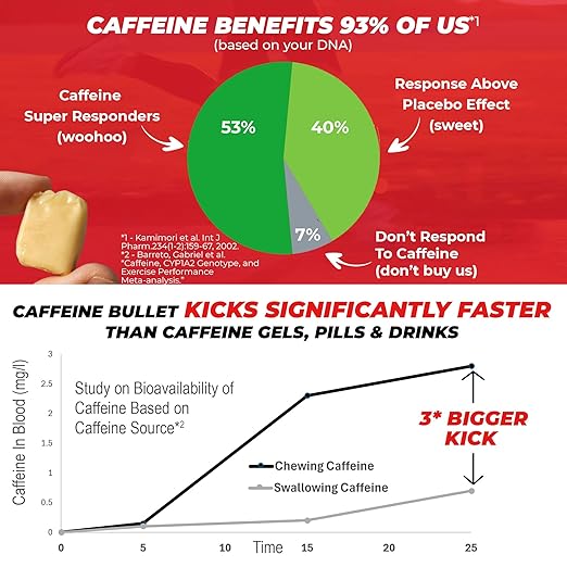 As you chew Caffeine Bullet the caffeine is absorbed in your mouth, bypassing your stomach, for a kick in only 5 minutes, peaking 3 times faster than gels, pills and drinks.
