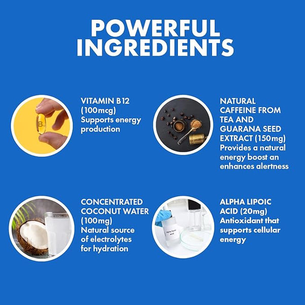 Only the finest quality ingredients, hand picked by scientists and nutritionists for their potency and effectiveness. This drink mix contains essential Vitamin B12, Raw Coconut Water Concentrate, natural caffeine from Guarana Seed Extract, and Alpha Lipoic Acid.