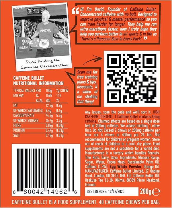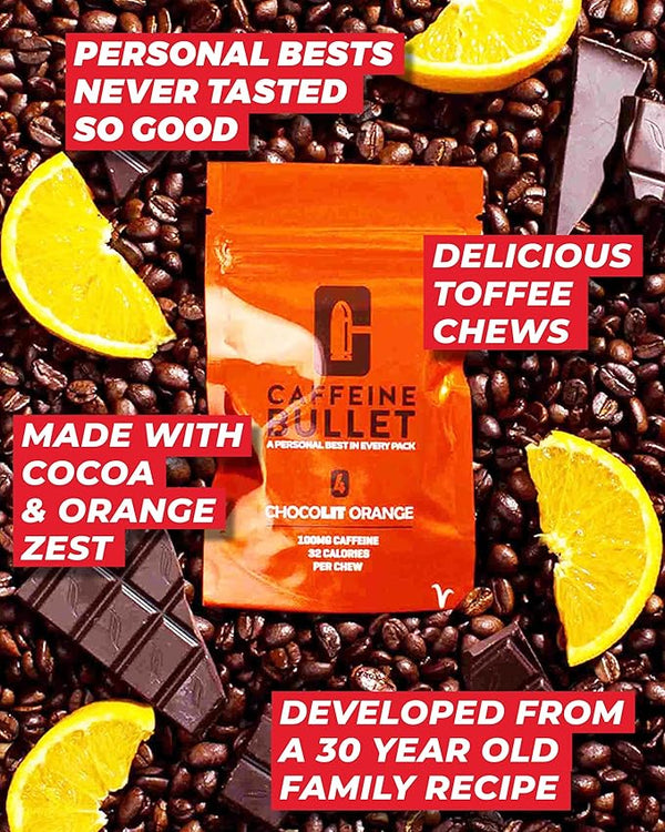 Caffeine Bullets are energy chews with a quick-release twist wrap. Every chew has 85mg of caffeine - the same as a strong coffee so that you can be back to your best performance with just one delicious chew.