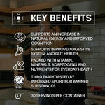 Health benefits that you may experience from just 1 scoop of Strong Greens daily include: increased energy and mental clarity, improved gut health and digestion, reduced stomach bloating and discomfort, reduced inflammation