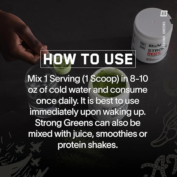 We recommend taking Strong Greens first thing in the morning, mixed with 8-10 oz of cold water. You can drink it by itself, mixed with Strong Reds (our Reds Superfood Powder), or with a protein shake.