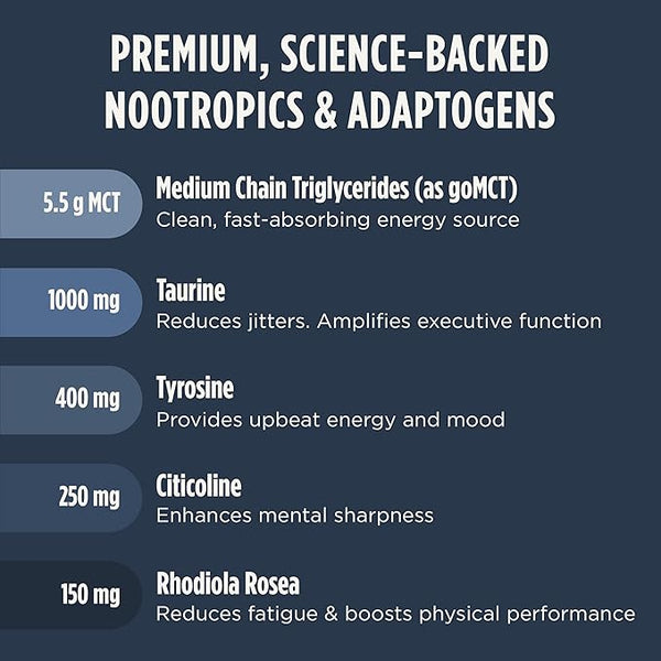 A star-studded cast of premium MCT, nootropics, and adaptogens to boost productivity and lift your spirits.