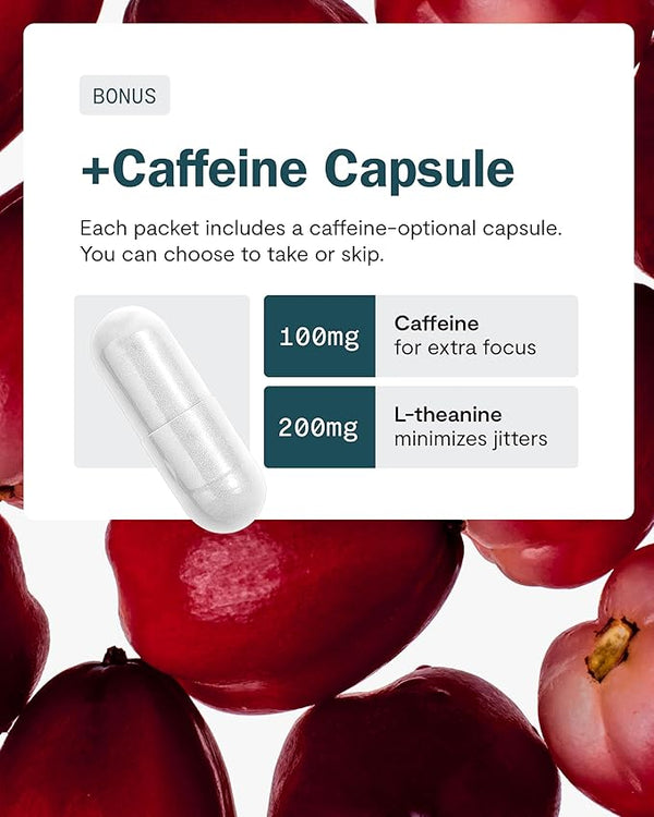Most Thesis users can still enjoy coffee while taking Thesis. Each packet includes a caffeine-optional capsule with 100 mg of caffeine and 200mg of L-theanine. You can choose to take or skip the white caffeine capsule.