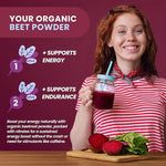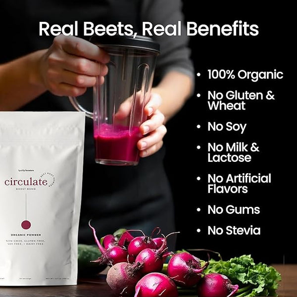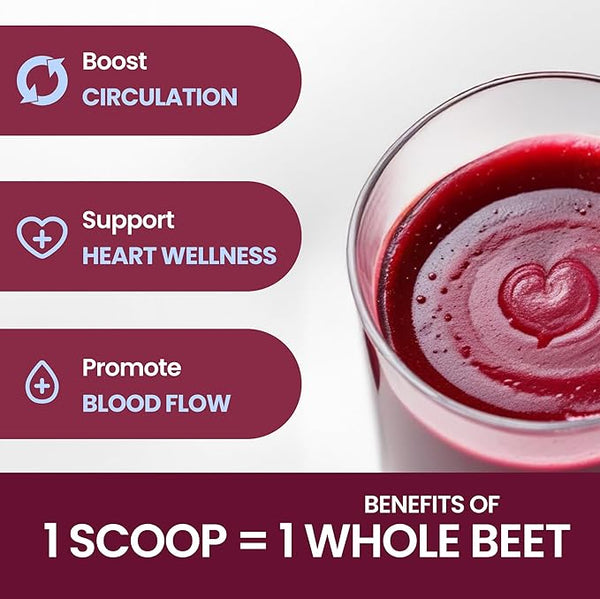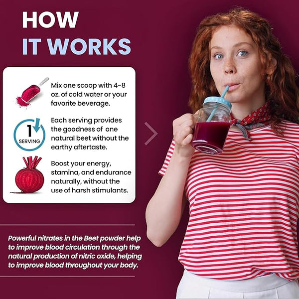 Why Choose Our Sweet Beet Powder? Supports Circulation & Energy: Rich in nitrates, our beet powder helps improve blood flow and boost stamina naturally. 30 Servings per Container: Enjoy long-lasting benefits with a single purchase. Versatile & Easy to Use: Mix into smoothies, juices, or baked goods for a nutritious boost. No Additives or Fillers: Just pure, organic beet powder with no artificial ingredients. How to Use: Add 1 scoop to 4 - 8 oz of cold water or your favorite beverage Customer Favorite: Loved by health enthusiasts for its great taste, easy mixability, and noticeable health benefits.