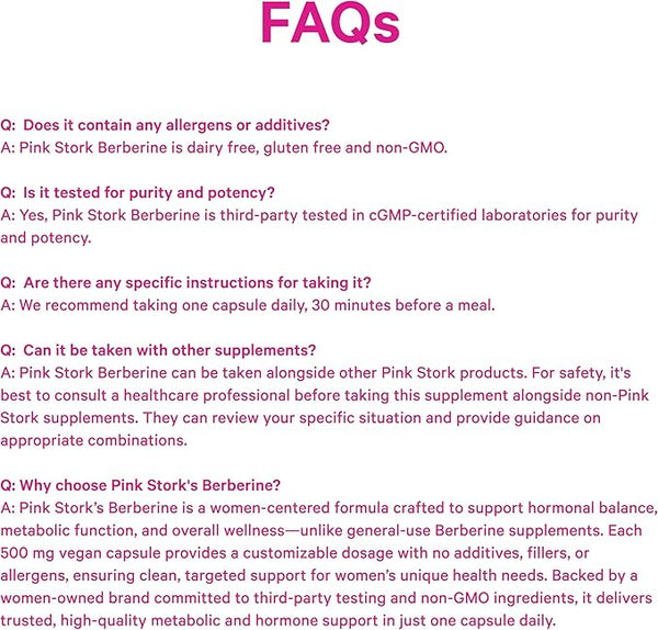 Pink Stork Berberine is formulated for daily use as part of a wellness routine. It¡¯s third-party tested, and free from soy, dairy, and gluten.