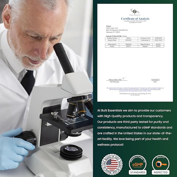 At Bulk Essentials, quality is our promise. Our products are tested for purity and consistency, manufactured to cGMP standards, and made in the USA. With a transparent supply chain and scientific validation, you can feel confident adding NAD+ Spray to your wellness protocol.