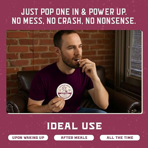 Caffeine Break Black Cherry Pouches are ideal for waking up, after meals, or anytime you need an energy boost. These zero-nicotine oral caffeine pouches provide a clean, healthy alternative to coffee.