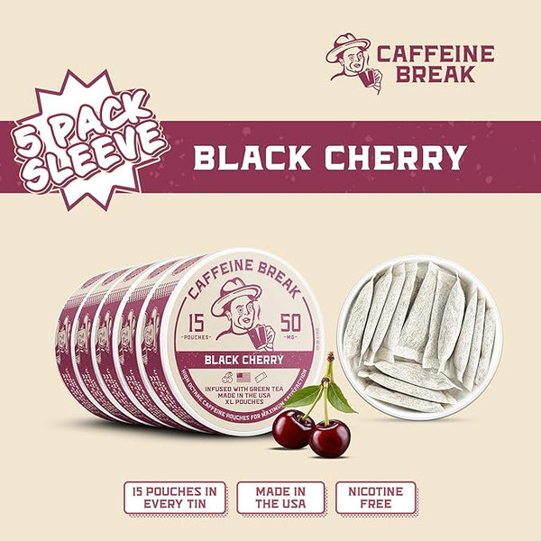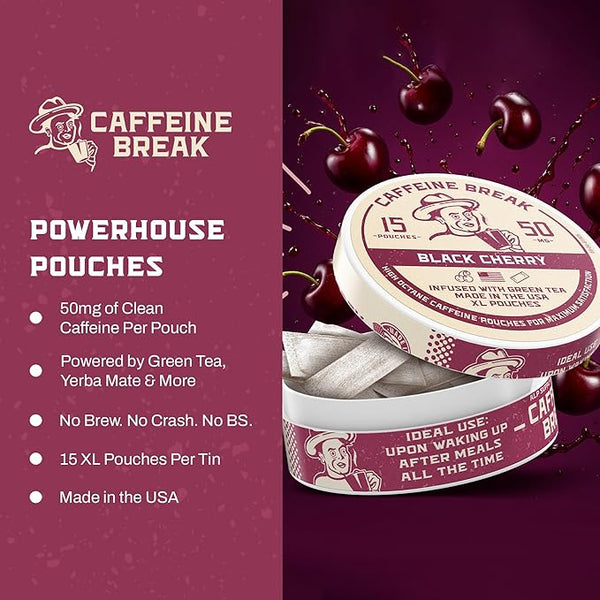 Product descriptionCaffeine Break Black Cherry PouchesHealthy Energy Boost with Blackberry FlavorCaffeine Break Black Cherry Pouches deliver a smooth, fruity flavor with a super-soft texture. These zero-nicotine caffeine pouches provide a...