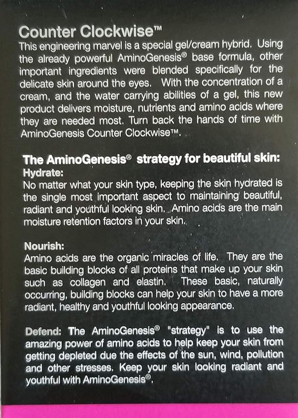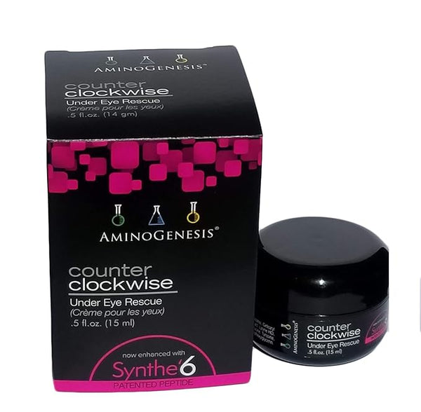 Achieve the timeless, elegant look you want with the help of AminoGenesis Counter Clockwise: Under Eye Rescue, now enhanced with a powerful new peptide blend called Synthe¡¯6. This is an eye cream/gel hybrid like no other in the world. With the power of the trusted AminoGenesis amino acid formula, plus the added boost of Synthe¡¯6, Counter Clockwise can help you achieve a smoother, brighter, and more youthful appearance without requiring any surgical or injectable procedures.