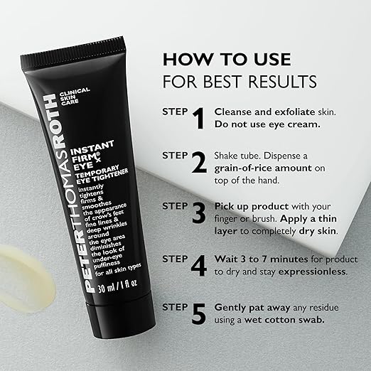 (1) Start by cleansing with an oil-free cleanser. Make sure skin is completely dry. Do not use cream around the eye area. (2) Shake the tube. Apply a pea-sized amount to the top of the hand. (3) Using a clean, dry makeup brush, pick up a tiny amount of the product. (4) Using upward strokes, spread a thin layer of the gel underneath the eyes for puffiness, onto the crow's feet area, onto the "11" lines between the brows, and beneath and above the brow bone (but not on the moveable eyelid). (5) Let the product dry for approximately 5 minutes while remaining expressionless?do not squint or smile. (6) If you notice any white residue, simply moisten a cotton swab (or your fingertip) and remove excess by gently patting the edges. (7) Once product is completely dry, you are good to go! You can gently pat on foundation and/or apply powder. For external use only.