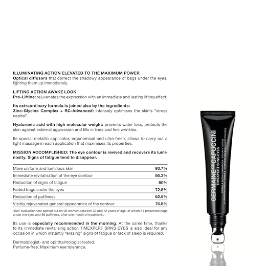 Reducing puffiness and bags under the eyes, this eye cream works specifically against Glycotoxins (which create puffiness and bags) with three actions: Anti-Fatigue Action: Its formula contains Albizia extract (also known as silk tree), which strengthens the energy production capacity of the cells to fight against the accumulation of toxins.