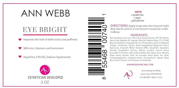 Product descriptionANN WEBB EYE BRIGHT: Non-greasy, anti-wrinkle cream w/collagen peptides, hyaluronic acid.Anti-Aging Eye Cream for Dark Circles & PuffinessSome of our FAVORITE PRODUCTS!We believe Skin Care does not have to...