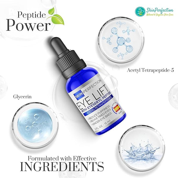 Ingredients: Glycerin, Water (Aqua), Acetyl Tetrapeptide-5. Acetyl Tetrapeptide-5 is a peptide that helps to reduce under-eye puffiness by fighting water retention. Paraben Free. Imported from Spain.