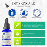 Our DIY Eyeseryl or Acetyl Tetrapeptide 5 is a serum booster used for decreasing undereye puffiness by draining your lymph vessels. As part of our DIY Collection, add this unique booster to your favorite anti-aging serum, cream, moisturizer, hyaluronic acid, or other skincare bases. You can also create an amazing homemade custom anti-aging product. Your eyes will look smoother, brighter, and more youthful. Fights discoloration in addition to puffiness. Product instructions and a usage guide are included with your purchase. Look younger by giving your eyes the help they've been needing. One .5 oz or 15ml bottle contains approximately 300 drops. You can make 3+, 1-ounce skincare products at a 10% concentration level. Simply add a 10% concentration to your homemade skincare formula, bulk base, or any ordinary cosmetic products and mix until well blended.