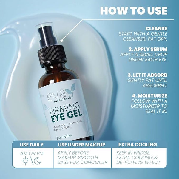 Eva Naturals Eye Gel isn¡¯t just for eyes ? it's your all-over firming solution. Apply to crow¡¯s feet, 11-lines, or laugh lines to smooth wrinkles, hydrate dry areas, and improve skin elasticity. Its fast-absorbing, non-greasy formula makes it the perfect wrinkle remover serum.