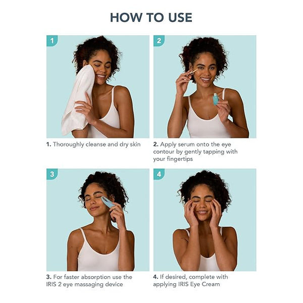 Apply IRIS Eye Serum & IRIS Eye Cream to minimize fine lines & dark circles. Massage with IRIS.