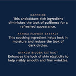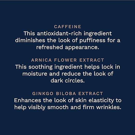 Product descriptionCaffeineArnica Flower ExtractSoothing MoisturizersGinkgo Biloba ExtractThis antioxidant-rich ingredient diminishes the look of puffiness for a refreshed appearanceThis antioxidant-rich ingredient diminishes the look of puffiness for a refreshed appearanceJojoba Oil...