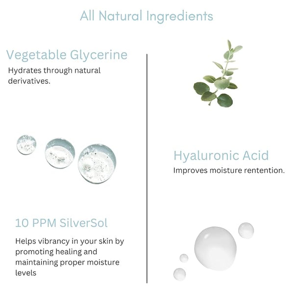 All Natural Ingredients. Contains SilverSol, Hyaluronic Acid and Organic Vegetable Glycerin.
