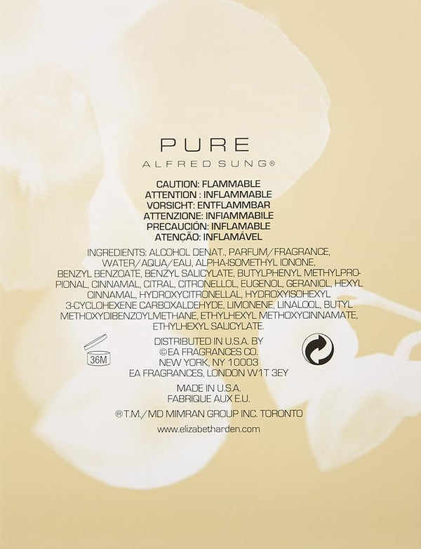 Pure by Alfred Sung is a Floral Green fragrance for women. Pure was launched in 1997. The nose behind this fragrance is James Krivda. Top notes are Tangerine, Tagetes and Orchid; middle notes are Lily, Pineapple, Peony, Freesia, Gardenia and Osmanthus; base notes are Woody Notes, Amber and Cinnamon.