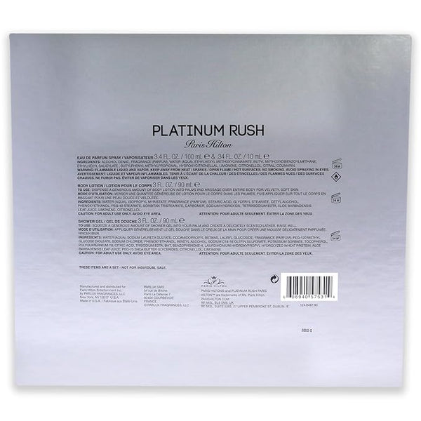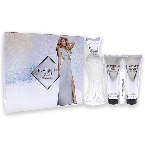 Paris Hilton Platinum Rush Women 4 Pc Gift Set 3.4 oz EDP Spray, 0.33oz EDP Spray, 3oz Body Lotion, 3oz Shower Gel