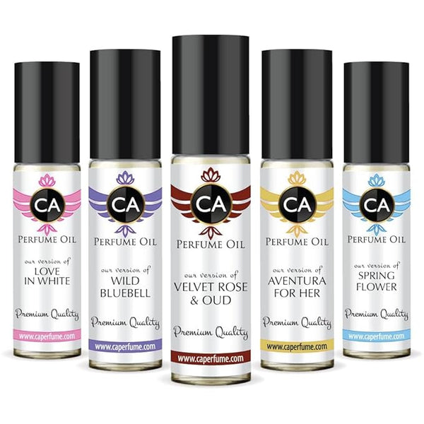 CA Perfume Niche Women Set Impression of (Love in White + Spring Flower + Aventura for Her + Velvet Rose Oud + WildBlubell) Fragrance Body Oils Travel Size Roll-On (0.3 Fl Oz/10 ml) Pack of 5