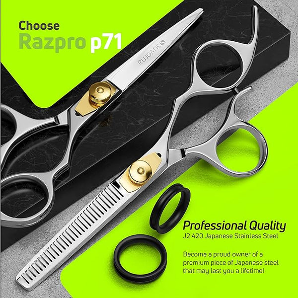 Many hair stylist prefers thinning scissors teeth to shape the ends of hair and maintain the length of bangs. This pair offers the greatest versatility, texturizing, effectively blending hair. You can cut 30% to 70% of hair with one or two cuts. Good thinning scissors hairdressing is always a good investment. Comes in a sealed box with an attractive carrying case that is small enough to be carried in bags. For best results and a perfect hair cut, hair should be washed and conditioned with a good quality shampoo and conditioner. A good-quality hair thinning comb is also handy. The Suvorna Razpro p71 Japanese Professional Razor Edge Hair Cutting Shears/Haircut Scissors are the perfect barber scissors kit & simple to use on men, ladies, the elderly, youngsters, and children!