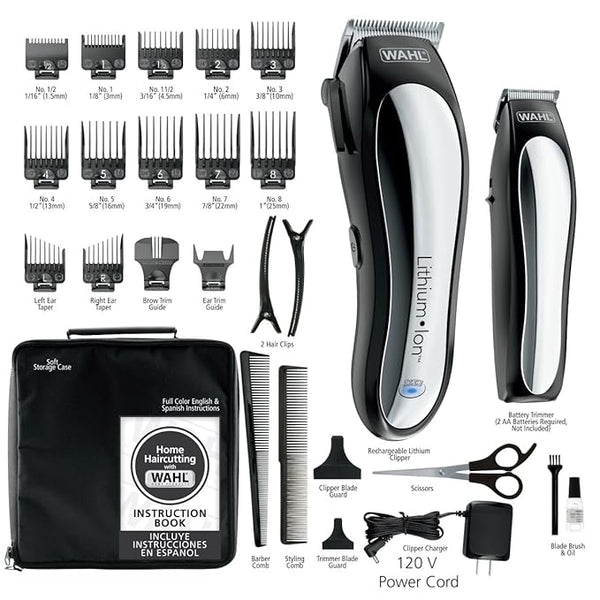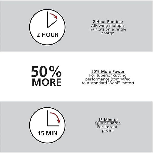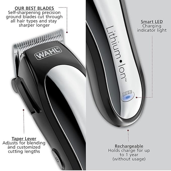 Premium hair clipper with advanced technology lithium-ion power for long-lasting performance. Wahl LithiumIon clipper provides a 2 hour run time, 10 minute quick charge, and holds a charge up to 1 year. Cordless convenience allows use anywhere at any time. Heavy duty motor provides 50 percent more power vs. standard Wahl motors for no-snag cutting. Includes