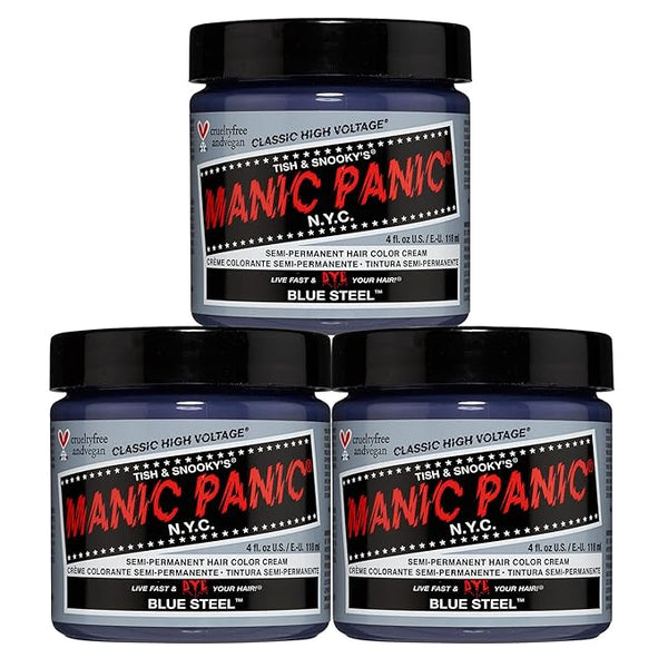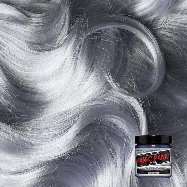 Blue Steel is a cool, silver hair dye with blue undertones. For best results, we recommend lightening hair to the lightest level 10 blonde and toning hair that has yellow tones before use to avoid undesired hues.