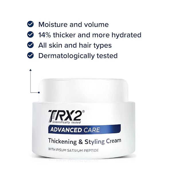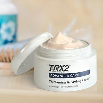 TRX2 Advanced Care Hair Thickening & Styling Cream is designed for instant volume and locked-in moisture. Pisum Sativum Peptide is the newest and most bio-available vegetable protein on the market. It boosts volume and locks in moisture to immediately enhance the look of the hair.