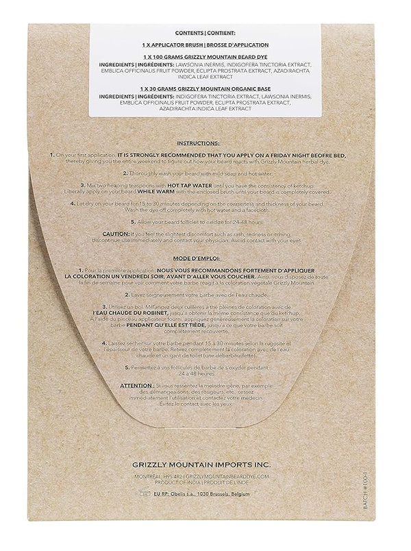 Welcome to Grizzly Mountain Beard Dye. The hypoallergenic, safe solution to overcome your aging beard. Using the highest quality, fresh ingredients, Grizzly Mountain offers you the perfect blend of plants and herbs that, when mixed together, delivers a natural oxidization process that colors the exterior of your beard follicles. It is a harmless process that uses no harsh chemicals and gives your beard varying shades that will always look natural (as opposed to chemical dyes that deliver a solid, flat colour that often looks ¡°fake¡±). Grizzly Mountain Beard dye is permanent and will not wash off when you shower or go swimming. A Grizzly Mountain beard will always look natural since the oxidization process respects the varying degrees of coarseness of your beard follicles. At last! You can stop putting your health at risk with extremely dangerous chemicals and safely use the Mountain Man¡¯s natural recipe to get the beautiful beard you want!