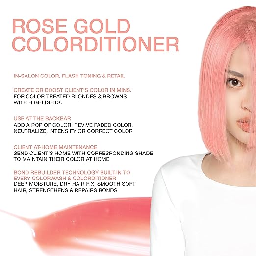 Pair Rose Gold Colorwash with Colorditioner for color-refreshing care. Cleanse, tone, and hydrate to maintain luminous rose gold shades in treated hair.