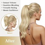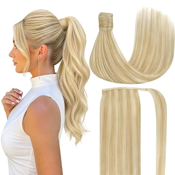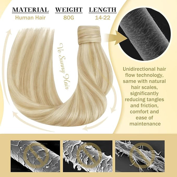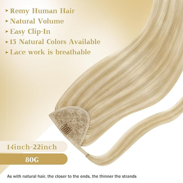 Our real human hair ponytails come in two textures: straight and curly, with lengths ranging from 14 to 22 inches and a uniform weight of 80g each.