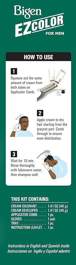 Product descriptionEasy, Comb-In ApplicationMultiple Applications for Hair and BeardGentle Formula with Aloe Extract and Olive OilFour Natural Shades to Choose FromBigen EZ Color for Men works on both your hair...