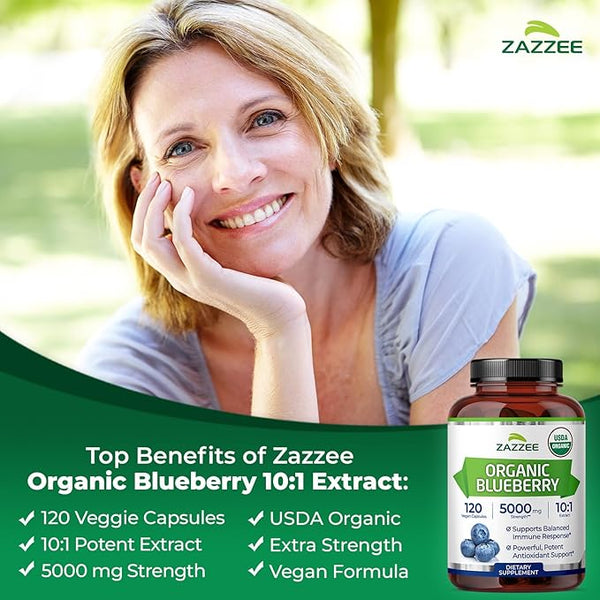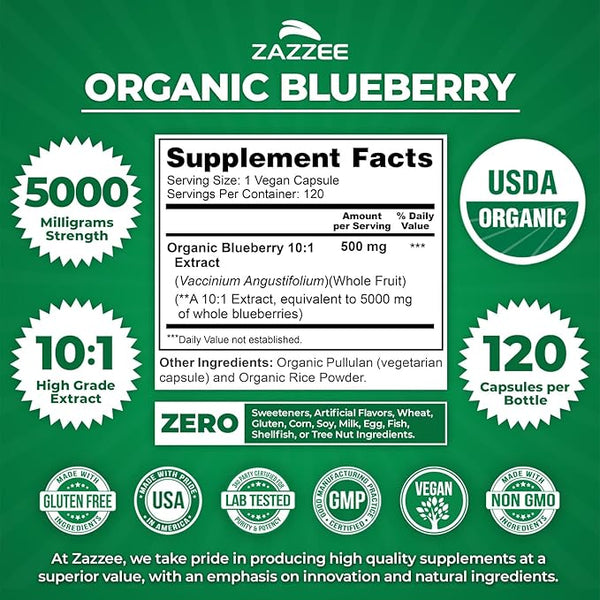 Product descriptionEnjoy Our Other Great Products!10:1 Extract, 5000 mg Strength, 120 Vegan Capsules, 10X Whole Fruit ExtractZazzee Organic Wild Blueberry Extract contains 5000 mg strength per capsule & is derived...