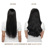 Vegan keratin, argan, macadamia, coconut oils, and quinoa.
