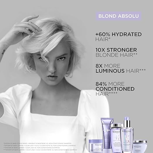 Blond Absolu provides instant care for the hair fiber and anti-brass neutralization to achieve that ideal cool blonde tone. Blond Absolu is formulated with ultra-violet neutralizers, hydrates, and fortifies the hair fiber for illuminated hair from within.
